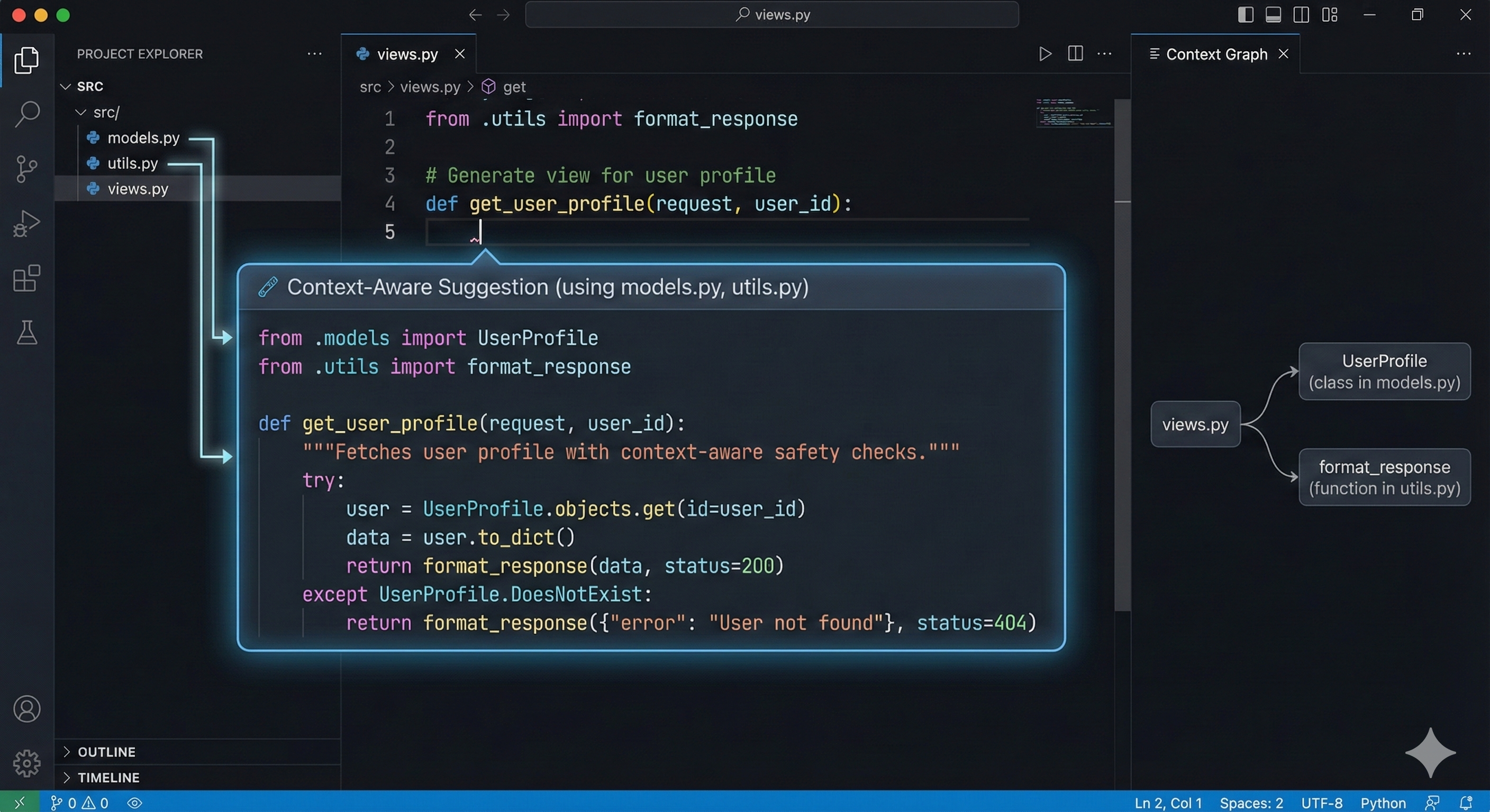 A demonstration of context-aware code generation, where the model uses definitions from existing project files (